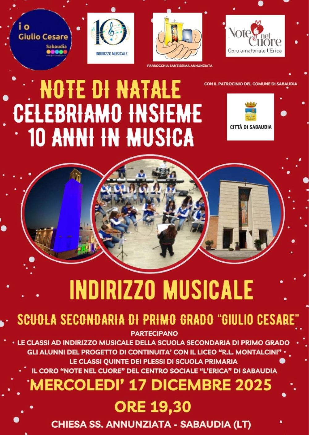 La Scuola Secondaria di Primo Grado “Giulio Cesare” – Indirizzo Musicale — insieme alla Parrocchia Santissima Annunziata e al coro amatoriale “L’Erica” (Note nel Cuore) — con il patrocinio del Comune di Sabaudia, presenta Note di Natale, un concerto per celebrare dieci anni di musica, con la partecipazione attiva di studenti, ex-alunni e del coro del territorio.